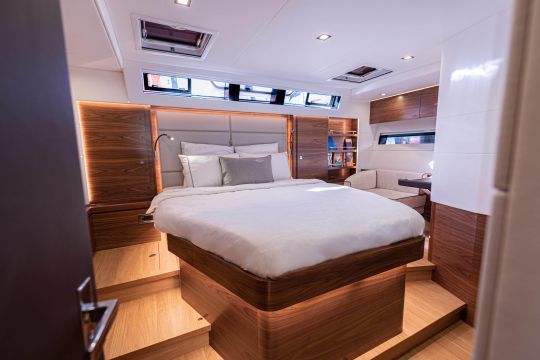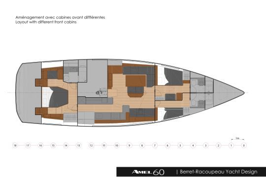 Ce modèle Amel 60 est présenté dans une version remaniée de ses aménagements intérieurs. L'immense cabine arrière reste réservée au propriétaire, tandis que les deux cabines avant adoptent une nouvelle configuration : une cabine double avec fauteuil et coiffeuse, et une cabine avec couchettes superposées. Chaque espace conserve sa salle d'eau privative. Ce nouvel agencement vise à répondre à des demandes de plus en plus fréquentes de propriétaires souhaitant embarquer famille ou équipage.