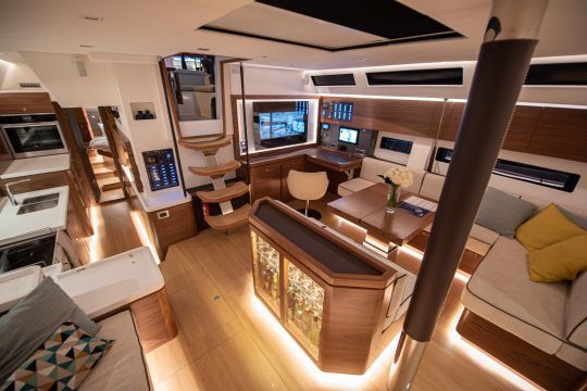 Avec ses 19 m, l'Amel 60 sera sans surprise le plus imposant voilier présenté au salon. Son exposition déquillée, sans mât, impose une logistique lourde : transport exceptionnel, démontage du hard-top et des balcons, remontage sur site. Une préparation à la mesure d'un voilier pensé pour la grande croisière.